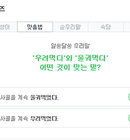 | 틀리기 쉬운 맞춤법 5. [우려먹다/울궈먹다] (0) | 2017.12.21 |